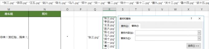 1、首先,在一個(gè)空白單元格中輸入半角雙引號(hào)(如O2單元格),然后在另一單元格Q2輸入公式“=$O$2&C2&".jpg"&$O$2&" "”,并向下填充,將生成的內(nèi)容全選復(fù)制、粘貼到文本文件中,再?gòu)奈谋疚募袕?fù)制文本,把復(fù)制的名稱(chēng)粘貼到另一個(gè)空白單元格中,本例中放在了R2單元格中。選中R2單元格,調(diào)出查找、替換窗口,在“查找內(nèi)容”里輸入Ctrl+J或者Ctrl+Enter,表示要替換的是回車(chē)符,而“替換為”處輸入英文狀態(tài)下的空格,點(diǎn)擊“替換”以后,就會(huì)出現(xiàn)加了以空格為分隔符的信息了。