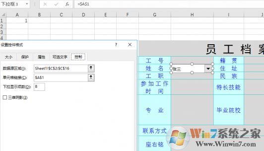 檔案信息表構(gòu)建完成后,新建一個(gè)工作表,設(shè)計(jì)好檔案界面,調(diào)整好顯示照片單元格的大小。點(diǎn)擊“公式”選項(xiàng)卡中的“名稱(chēng)管理器”,新建名稱(chēng)“圖片”,引用位置為“=INDEX(Sheet1!$N:$N,MATCH(INDEX(Sheet1!$B2:$B16,Sheet3!$A$1,),Sheet1!$B:$B))”。選擇“開(kāi)發(fā)工具”選項(xiàng)卡,點(diǎn)擊“插入→表單控件”下的“組合框”,在姓名位cncxm.com置畫(huà)個(gè)組合控件,右擊這個(gè)控件,選擇“設(shè)置控件格式”,在彈出窗口數(shù)據(jù)源區(qū)域選擇信息表中的C2:C16,鏈接單元格選擇A1(當(dāng)然也可選擇其他空白單元格),這樣就形成了下拉列表菜單,如圖所示: