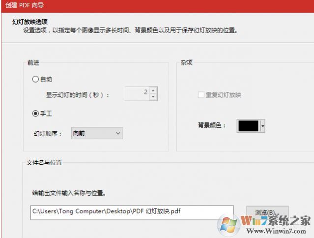 進入選擇圖像窗口后,用“添加”或“刪除”按鈕對原圖片列表進行增刪操作,用左右雙箭頭按鈕對選中的圖片進行位置變換操作;之后進入下一步,為圖片選擇轉(zhuǎn)場效果;隨后再設(shè)置幻燈片放映選項,可選擇自動播放或手動控制播放,并設(shè)置PDF幻燈片文件輸出路徑和文件名;點擊“下一步”后,這樣就自動完成了幻燈片型PDF的創(chuàng)建。
