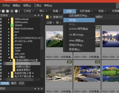 在ACDSee Pro 8中打開制作PDF所需的原材料圖片,然后執(zhí)行菜單命令“創(chuàng)建→PDF”,如圖: