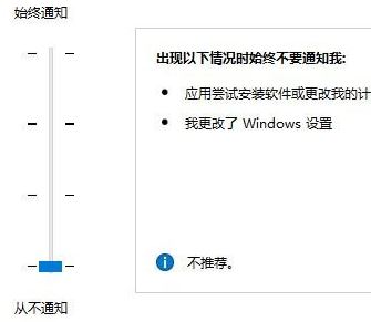4、在彈出的用戶賬戶控制設置,將滑塊移動到最底部,點擊確定保存設置即可!