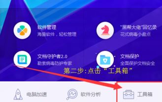 1、打開進(jìn)入“電腦管家”工具首頁后,點(diǎn)擊界面右下方的“工具箱”按鈕;