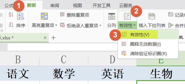 2、點擊頂部菜單欄中的“數(shù)據(jù)”→“有效性”→“有效性(V)”按鈕,彈出“有效性”設(shè)置對話框,如圖: