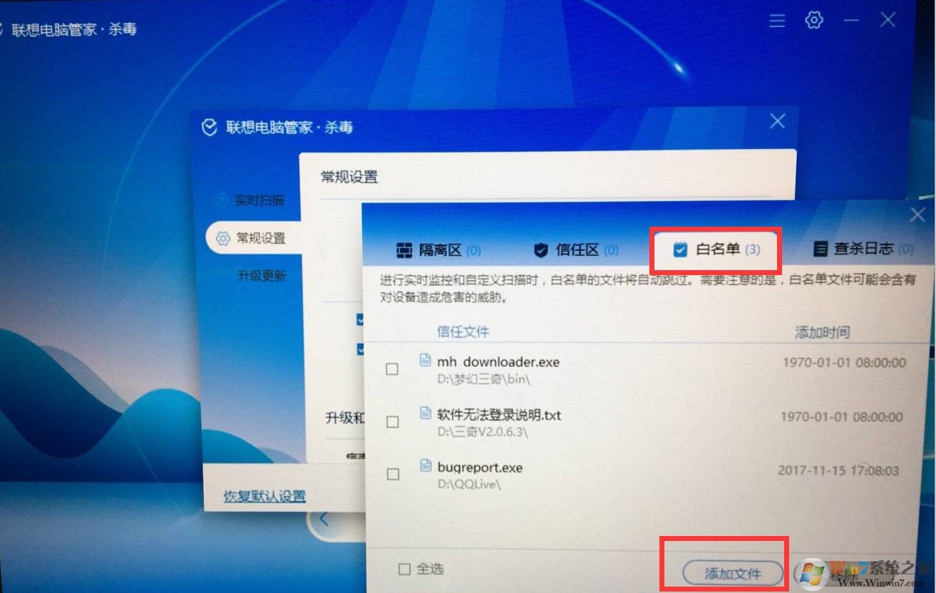 3、點擊白名單,選擇右下角“添加文件”即可將指定文件添加到白名單目錄,從而避免被殺毒軟件查殺。