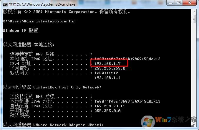 2、輸入ipconfig 回車,我們可以得到XP電腦的IP地址,得到 192.168.1.7