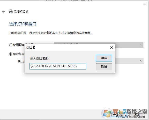 6、這時出現(xiàn)一個端口名的輸入框,我們輸入第一步獲取的IP地址和打印機名:\\192.168.1.7\EPSON L310 Series 然后確定
