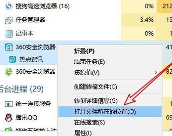 3、右鍵點擊該進程,在彈出菜單中選擇“打開文件所在的位置”菜單項,如圖: