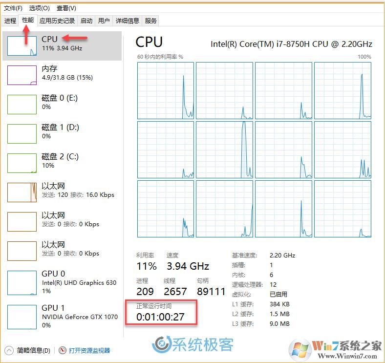 2、點(diǎn)擊「性能」選項(xiàng)卡——點(diǎn)擊「CPU」選項(xiàng)
