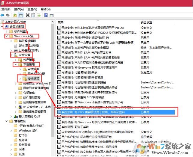 2.左側(cè)列表中找到 計(jì)算機(jī)配置 - Windows設(shè)置 - 安全設(shè)置 - 本地策略 - 安全選項(xiàng),并在右側(cè)找到“系統(tǒng)加密:將FIPS兼容算法用于加密、哈希和簽名”