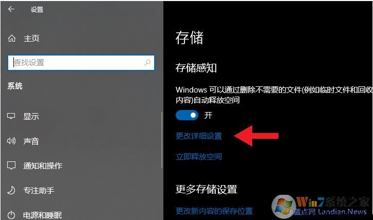 點(diǎn)擊開(kāi)始菜單—左側(cè)齒輪按鈕進(jìn)入Windows 10設(shè)置,然后在系統(tǒng)菜單點(diǎn)擊左側(cè)的存儲(chǔ)感知—更改詳細(xì)設(shè)置。