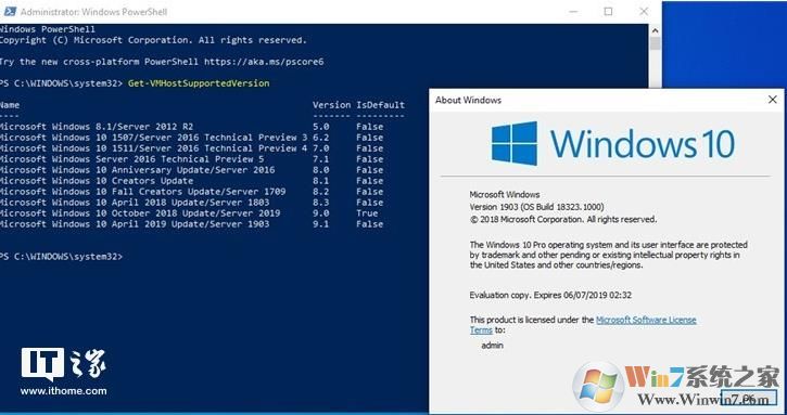 在Windows 10 19H1快速預覽版18323中,如果運行PowerShell命令Get-VMHostSupportedVersion,它將列出所有受支持的Windows 10版本的名稱,并且還顯示出了“Windows 10 April 2019 Update”版本。Windows 10 19H1 18323更新安裝后,系統(tǒng)版本顯示1903。