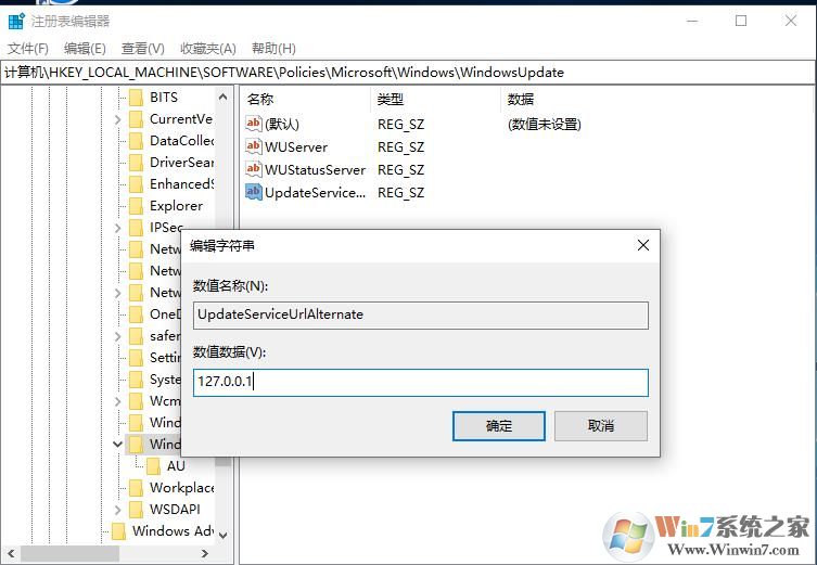 3、接下來創(chuàng)建三個(gè)字符串值,名稱分別是 "WUServer"、"WUStatusServer"、"UpdateServiceUrlAlternate",分別把數(shù)值都修改為"127.0.0.1" cncxm.com