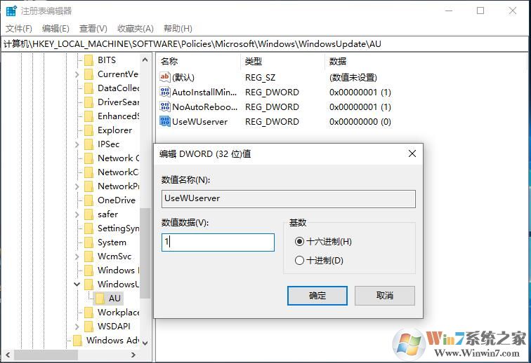 5、新建dword值 ,名稱為"UseWUServer",數(shù)值為1 如果沒有該路徑,請(qǐng)您新建路徑。