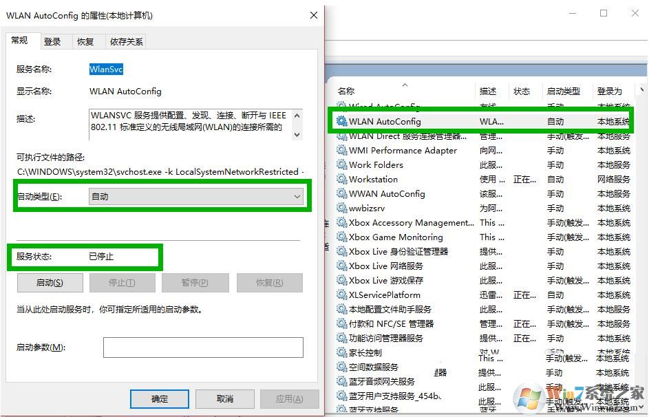 2、打開【服務(wù)】列表后,找到【WLAN AutoConfig】服務(wù),看看這個服務(wù)有沒有啟動,然后雙擊打開屬性窗口,查看啟動類型是不是自動,如禁用肯定是不行的,改為自動,再啟動服務(wù)。