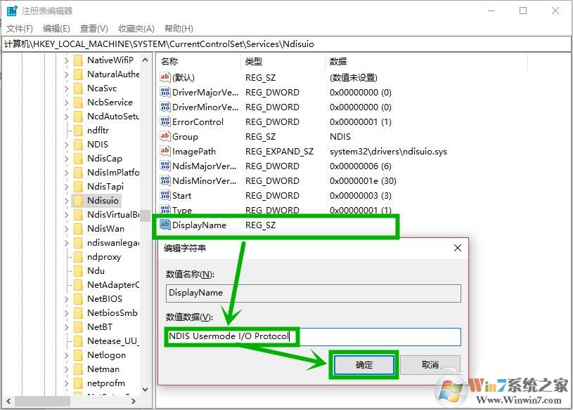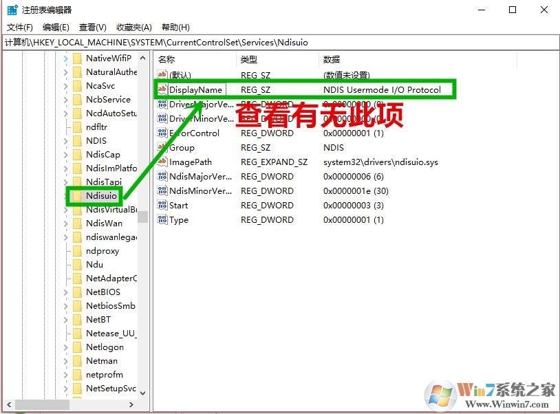 然后定位到:計算機\HKEY_LOCAL_MACHINE\SYSTEM\CurrentControlSet\Services\Ndisuio,在右側(cè)查看是否有【DisplayName】,數(shù)據(jù)為【NDIS Usermode I/O Protocol】的項(如圖),沒有需要新建,往下看