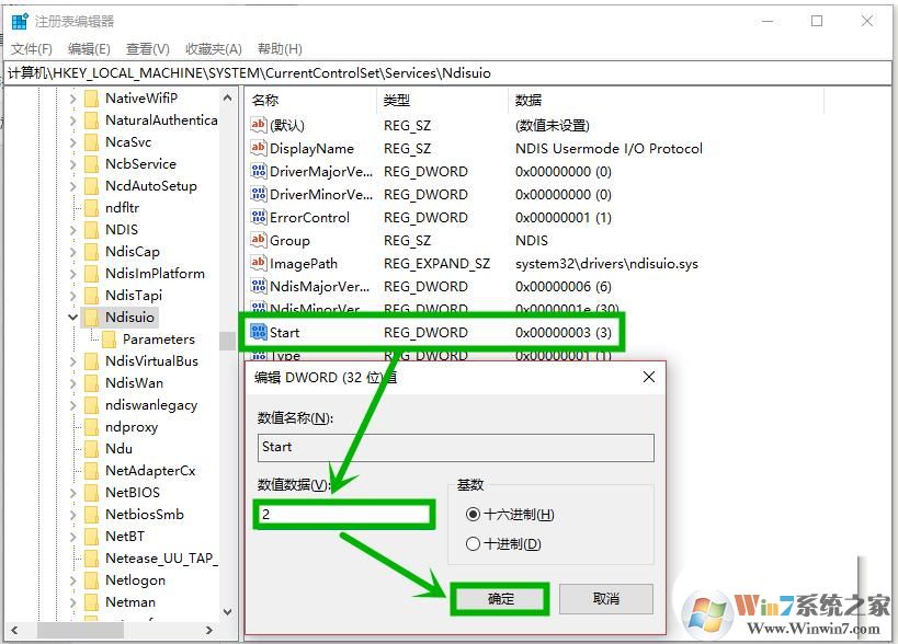 5、繼續(xù)在右側(cè)雙擊【start】項(沒有同樣可以新建DWORD值),將【數(shù)值數(shù)據(jù)】修改為【2】然后點擊【確定】,然后按F5刷新