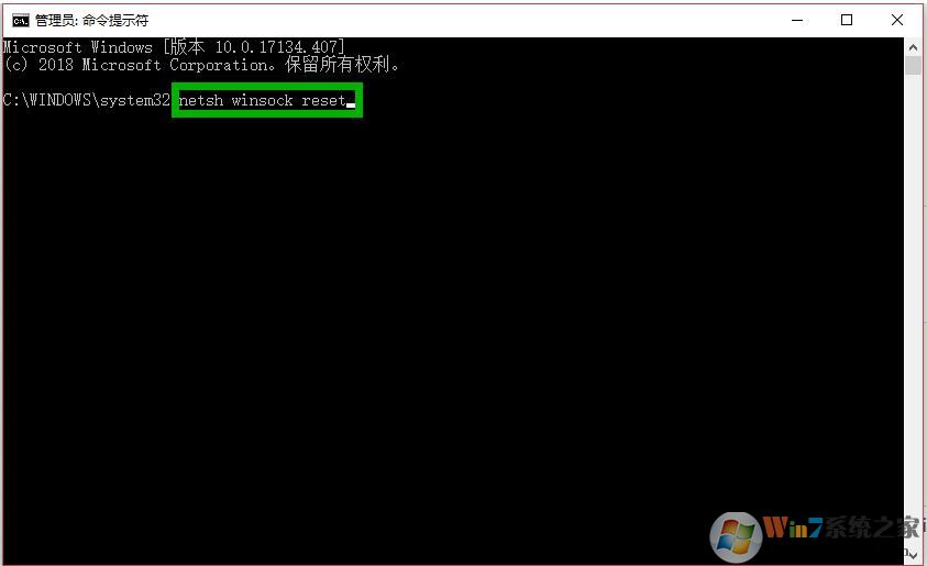 7、在打開的【管理員:命令提示符】界面,輸入“netsh winsock reset”(這個命令是重置網(wǎng)絡(luò)用的)后回車,重啟電腦就行了