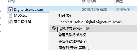 3、打開(kāi)文件夾,在DigitalLicense.exe上單擊右鍵,選擇【以管理員身份運(yùn)行】;