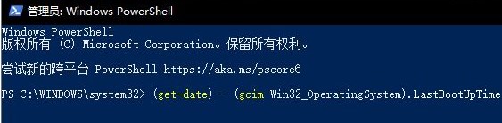 以管理員身份運(yùn)行Windows PowerShell,在打開的“管理員: Windows PowerShell”窗口中輸入并回車運(yùn)行以下命令:(get-date) - (gcim Win32_OperatingSystem).LastBootUpTime
