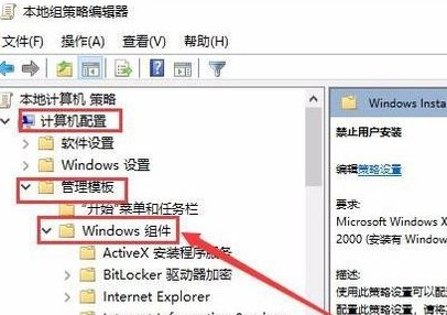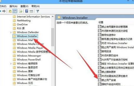 5、在打開的Windows組件菜單項中找到Windows Installer菜單項,在右側(cè)找到禁止用戶安裝一項;