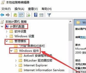 4、在本地組策略編輯器窗口中,依次點擊計算機(jī)管理/管理模板/Windows組件菜單項;