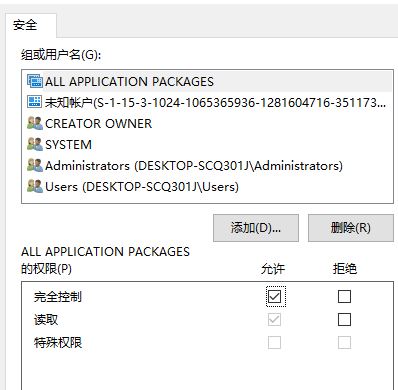 在 右側(cè) 右鍵“權(quán)限”,找到“ALL APPLICATION PARKAGES”,在允許一欄中勾選完全掌控,點(diǎn)擊應(yīng)用,點(diǎn)擊確定,如圖: