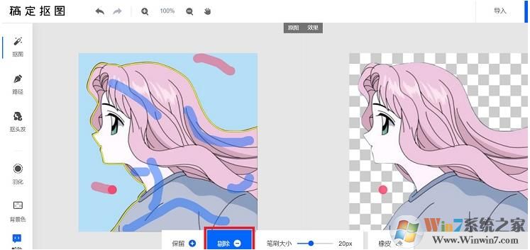 3、下面以摳圖一張透明微信頭像為例,上傳好需要摳圖的圖片后,首先點(diǎn)擊“保留”,然后在圖中劃出需要保留的部分,畫(huà)一道線即可。然后點(diǎn)擊“剔除”,在需要去除的部分畫(huà)一道紅色即可~。