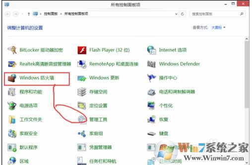 2、在控制面板中找到Windows防火墻;