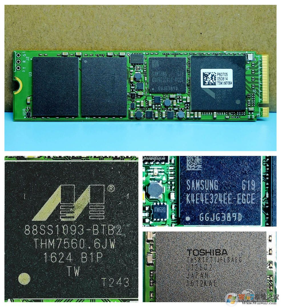 完成華碩M6E主板的BIOS改造之后,就要來(lái)實(shí)際測(cè)試一下對(duì)PCIE NVMe SSD的支持程度了。浦科特M8PeY的PCIE版本其實(shí)就是一個(gè)M.2接口的SSD加上一個(gè)PCIE轉(zhuǎn)接卡。PCIE轉(zhuǎn)接卡上有一個(gè)M.2接口,安裝有一個(gè)2280規(guī)格的M8Pe SSD,PCIE轉(zhuǎn)接卡上還有兩組LED燈,一組是白光常亮的,另外一組是紅光帶呼吸燈燈效的。SSD本身和M.2接口的M8Pe完全沒有兩樣,SSD的PCB上有一個(gè)主控芯片+一個(gè)緩存顆粒+兩個(gè)NAND顆粒。主控芯片采用Marvell 88SS1093,三核心8通道,原生支持PCIE NVMe主控,采用28nm制程,每個(gè)通道支持8CE/Die,最高支持2TB的容量,支持NAND Edge error-correcting和LDPC技術(shù)。緩存方面采用了三星的LPDDR3顆粒,單顆容量512MB,頻率為1600MHz。NAND顆粒則采用了東芝原廠BGA封裝的Toggle 15nm MLC NAND,單顆容量256GB,一共兩顆組成512G的總?cè)萘?。隨SSD附送有一個(gè)“矮個(gè)子”的PCI固定擋板,因此M8PeY也可以安裝在超薄機(jī)箱內(nèi)。