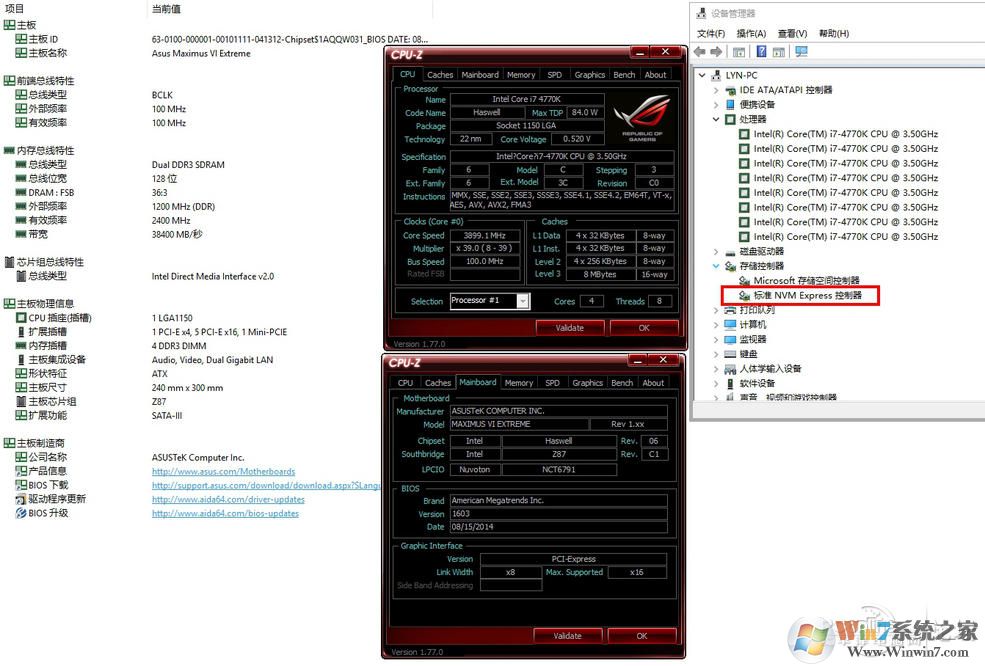 完成硬件安裝之后進(jìn)入Windows系統(tǒng),在“設(shè)備管理器”中可以看到增加了一個(gè)“標(biāo)準(zhǔn)NVM Express控制器”,說(shuō)明已經(jīng)成功為Z87主板添加了對(duì)NVMe的支持。