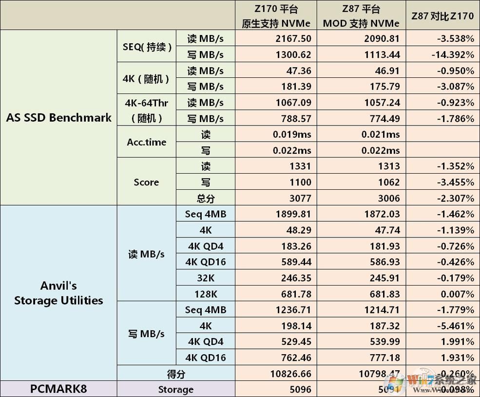 從測(cè)試結(jié)果中可以看到,作為目前PCIE NVMe SSD的旗艦級(jí)產(chǎn)品,浦科特M8PeY 512G在Z170主板上的性能表現(xiàn)是非常強(qiáng)勁的,基本代表了目前家用固態(tài)硬盤的頂級(jí)性能。而在我對(duì)Z87主板的BIOS進(jìn)行改造之后,浦科特M8PeY也能夠在Z87主板上服役,而且表現(xiàn)也同樣很搶眼,ASS SSD的分?jǐn)?shù)在Z170上是3077分,在Z87上是3006分,相差2.3%;Anvil’s Storage Utilities的分?jǐn)?shù)在Z170上是10826.66,在Z87上是10798.47,相差0.26%;PCMARK8的Storage分?jǐn)?shù)在Z170上是5096,在Z87上是5091,相差0.098%。在Z87上的各項(xiàng)測(cè)試成績(jī)均以極小的幅度落后于Z170平臺(tái),落后幅度在誤差范圍內(nèi),而且考慮到兩個(gè)平臺(tái)的內(nèi)存頻率相去甚遠(yuǎn),所以這個(gè)測(cè)試成績(jī)說(shuō)明Z87主板在修改BIOS之后是完全可以完整支持NVMe的。