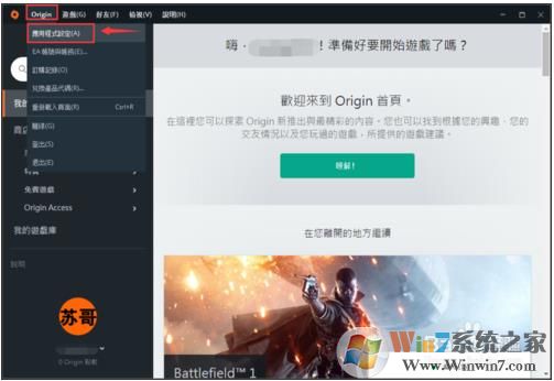 1、首先打開origin平臺并登錄,然后點擊左上角的"origin"按鈕,選擇"應(yīng)用程序設(shè)定",