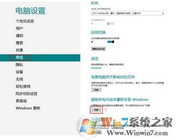 2、選擇“常規(guī)”,在“刪除所有內(nèi)容并重新安全Windows”目錄下點擊“開始”。