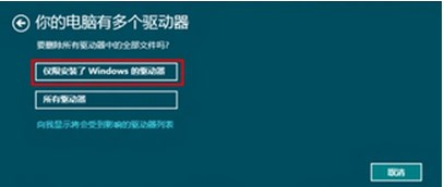 4、在彈出的“你的電腦有多個驅(qū)動器”彈窗里可以選擇“僅限安裝了Windows的驅(qū)動器”或者“所有驅(qū)動器”來確定初始化范圍。這次選的是“僅限安裝了Windows的驅(qū)動器”,這個選項將會把C盤數(shù)據(jù)初始化。