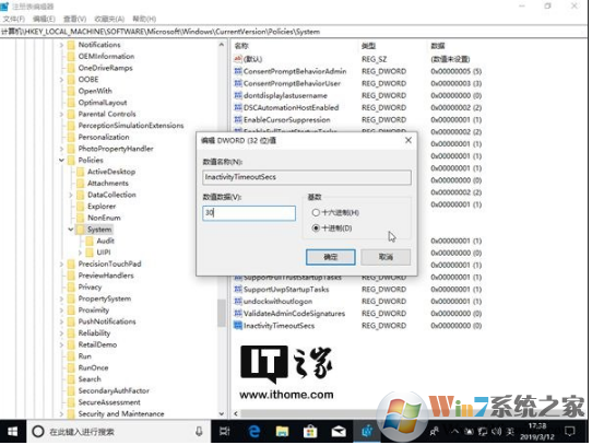 4、雙擊我們剛剛新建的名為“InactivityTimeoutSecs”的DWORD(32位)值,注冊表編輯器將彈出一個“編輯DWORD(32位)值”窗口,在這個窗口中,我們可以將DWORD(32位)值的數(shù)值數(shù)據(jù)設(shè)置為0到599940之間的任意整數(shù)。