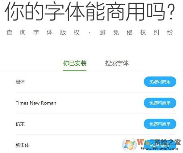 4、除了可以查電腦上已經(jīng)安裝的字體,也可以手動搜索其它字體查詢是否是免費的,還是需要商用授權(quán),如下圖所示。