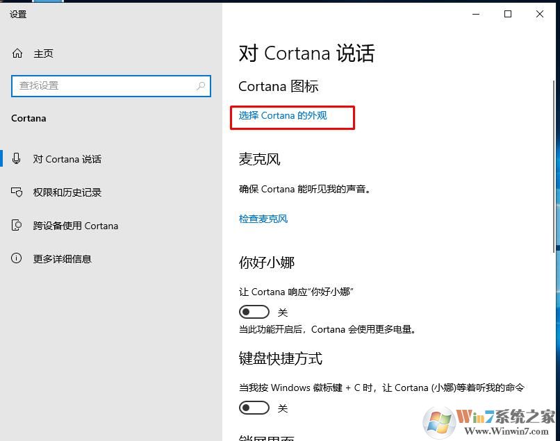 2、彈出的設(shè)置界面中,點(diǎn)擊選擇cortana的外觀;