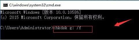 2、接下來(lái)會(huì)打開(kāi)命令提示符窗口,我們?cè)佥斎隿hkdsk g: /f,需要說(shuō)明的是,g這個(gè)是指的你的U盤(pán)的盤(pán)符,你的U盤(pán)的盤(pán)符是哪一個(gè),你就修改成哪一個(gè)字母就行了;