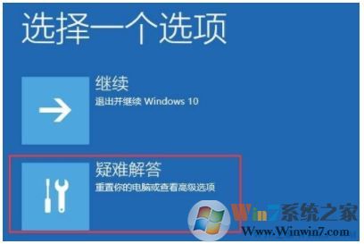 2、重啟的時(shí)候就會(huì)進(jìn)入藍(lán)色界面,我們在該界面點(diǎn)擊【疑難解答】,如圖: