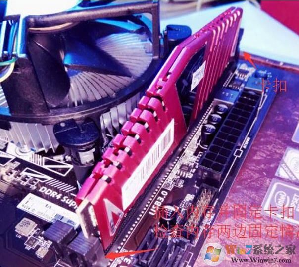 對準插入內(nèi)存條并下壓,并檢查內(nèi)存條兩邊的卡扣固定情況,一定要到位,并且扣住!