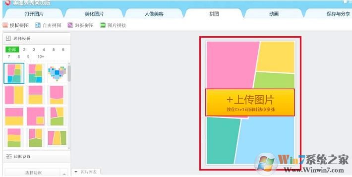 3、將多張圖片上傳之后,我們可在在左側(cè)選擇你要拼接的樣式,要什么形狀。左側(cè)提供了一些常用的拼圖魔板,分為模板拼圖、自由拼圖、海報拼圖、圖片拼接等多種拼圖方式可選,右側(cè)可以直接預(yù)覽拼圖效果,如下圖所示。