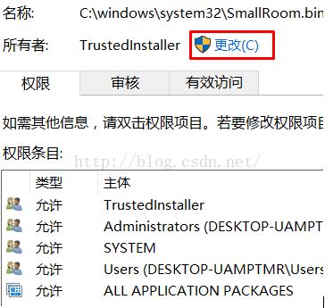2、出現(xiàn)所有者界面,我們點(diǎn)擊所有者那里同,可以看到所有者為trustedinstaller,我們點(diǎn)擊更改;