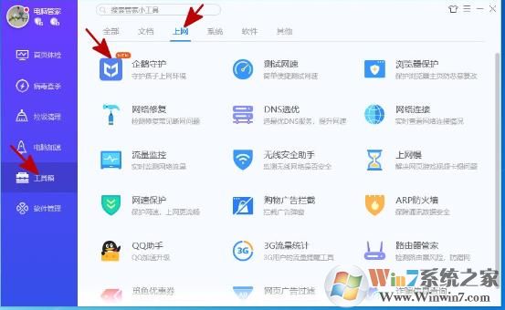 2、安裝之后,我們打開電腦管家找到工具箱,選擇上網(wǎng)狀態(tài)欄里面的企鵝守護: