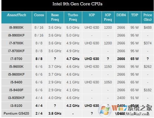 i3-9000:4核心4線程,6MB,3.7GHz,DDR4-2400,65W;