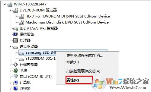 2、打開設(shè)備管理器,然后找到你的固態(tài)硬盤,右鍵屬性,如下圖所示: