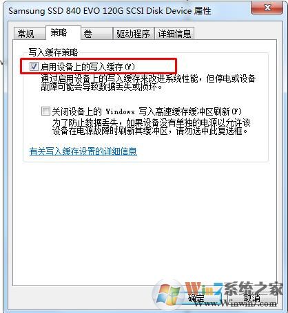 cncxm.com 3、看下“啟用設(shè)備上的寫入緩存”這項(xiàng)有沒有勾選,沒有的話勾選一下。然后確定。