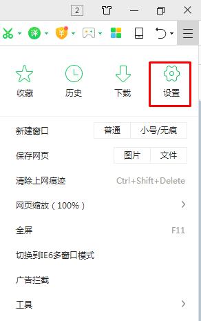 1、打開360瀏覽器右上方的三橫,點擊設置,如下圖