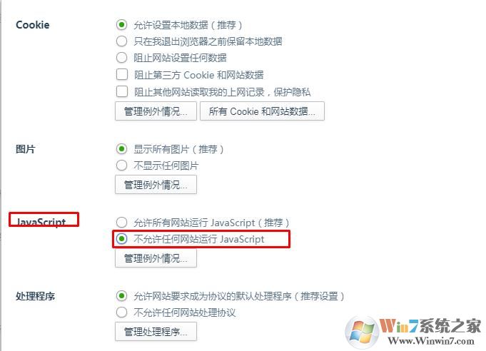 3、如果要禁用所有網站的javascrtpt腳本,那么按下面的選擇不允許任何網站就可以了,如果只需要禁用某個網站,那么點擊管理例外情況;