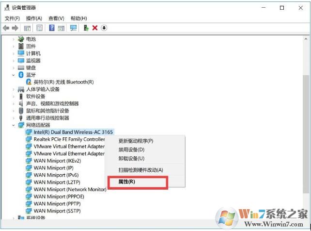 5、點開網(wǎng)絡適配器,右鍵點擊你的無線網(wǎng)卡,屬性(無線網(wǎng)卡一般會有wireless名稱)