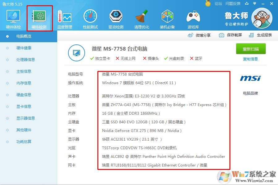 3、安裝并打開魯大師后,我們可以在【硬件檢測】欄目下查看到電腦的配置信息;